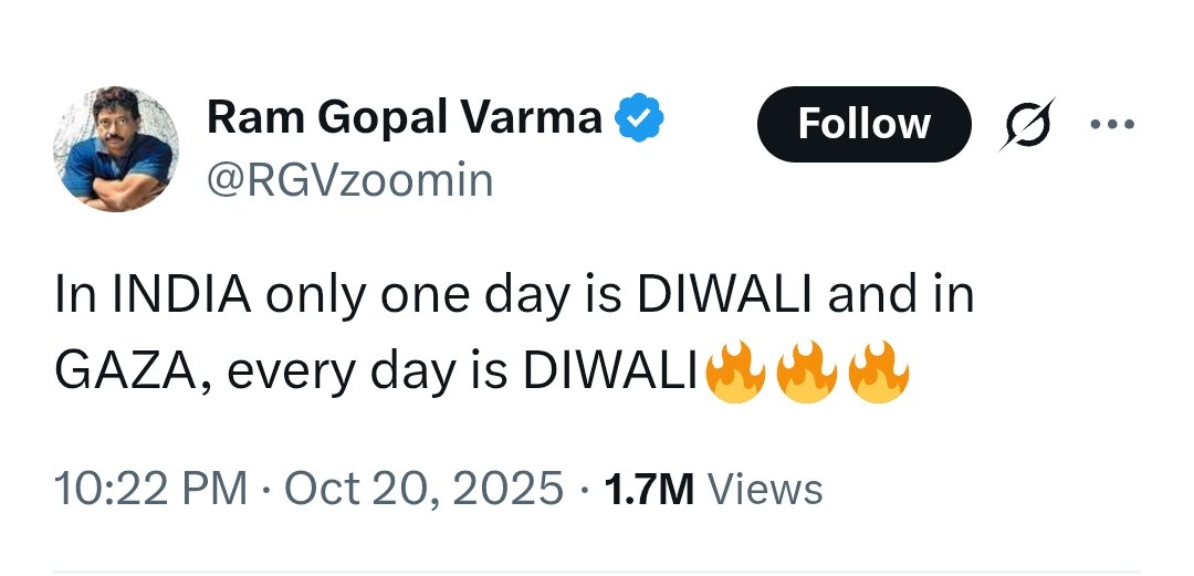 When filmmaker Ram Gopal Varma posted on X (formerly Twitter) this Diwali, “In INDIA only one day is DIWALI and in GAZA, every day is DIWALI,” he may have intended a crude joke. But the reaction revealed something far darker.