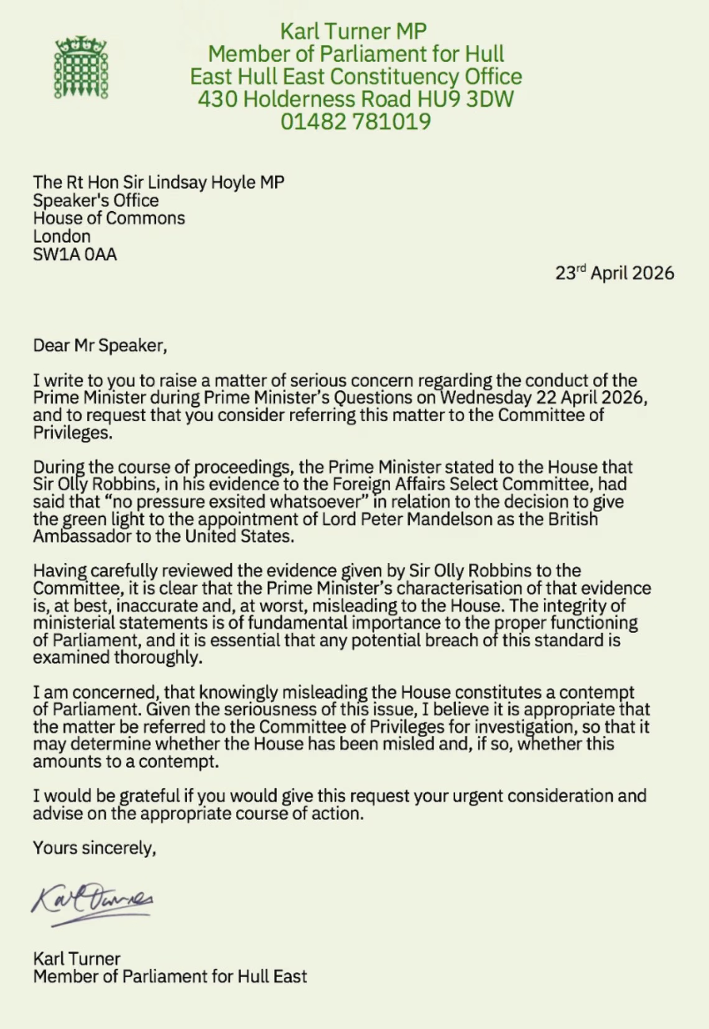 On Wednesday, 23 April, the crisis entered a new and perilous phase for the Prime Minister. Karl Turner, a suspended Labour MP who lost the whip last month after a series of interventions criticising Starmer and No 10, wrote to Commons Speaker Sir Lindsay Hoyle urging him to refer Starmer to the Committee of Privileges.